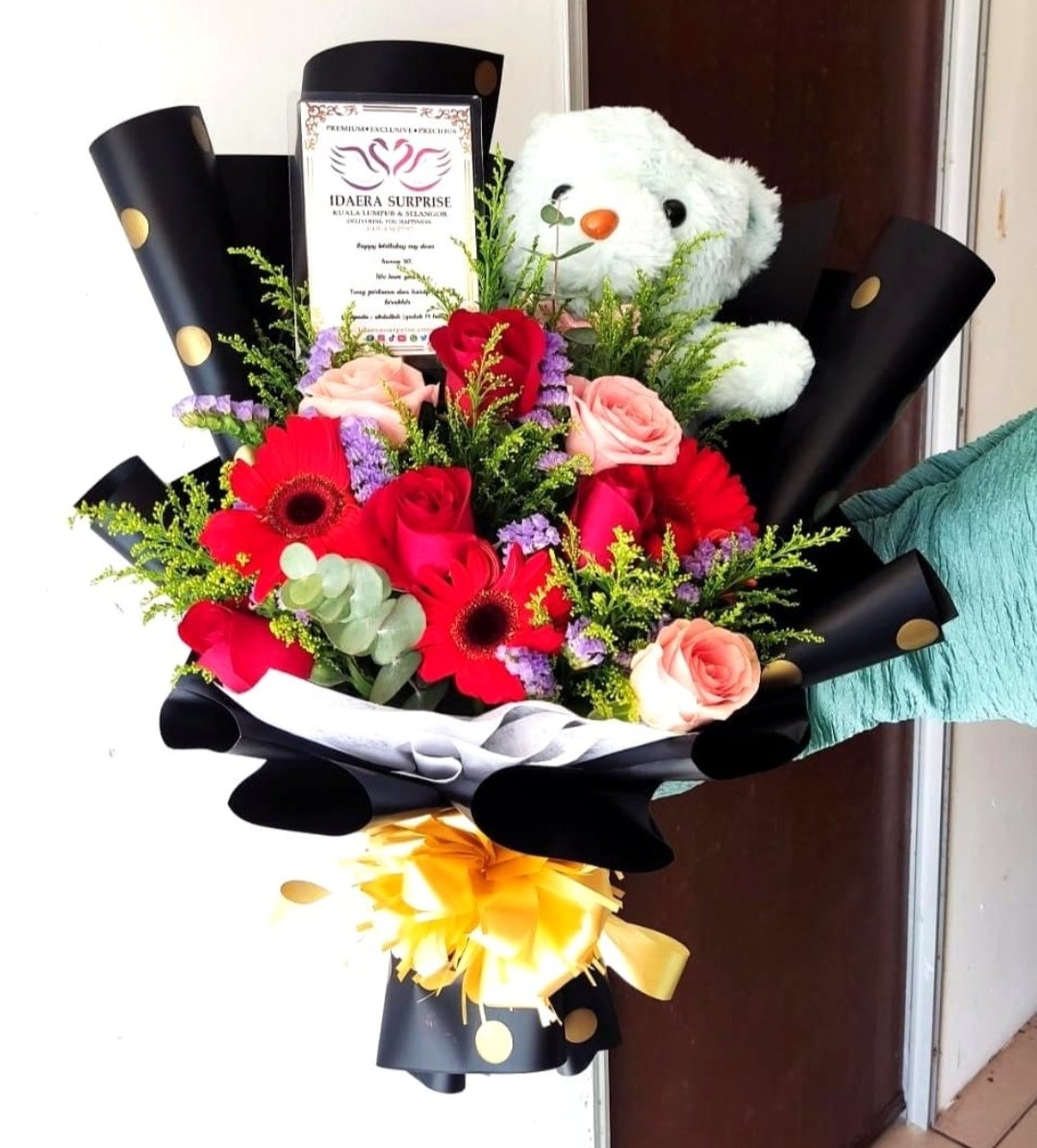 Each bouquet is handcrafted to create a joyful blend of blooms and is paired with a soft teddy bear to add a comforting and lovable touch.